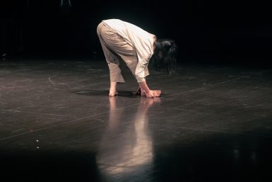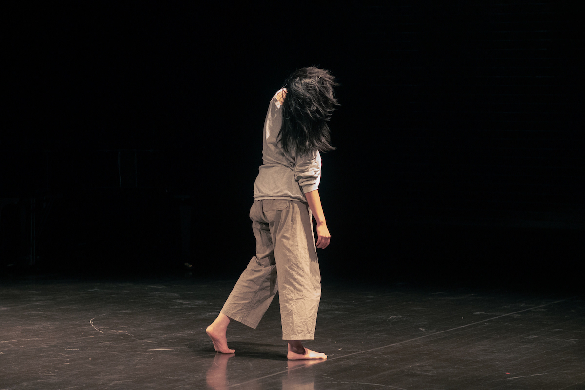 黒田杏菜 3番目に上演した黒田杏菜です。タイトルは《リスニング》にして、身体の内側を聞くということをやっていました。なぜそれをやったのかというと、今回テーマが民主化についてということで、自分の活動について考えました。私はそこに座っているカークパトリックデイビットさんと二人で、Murasaki Penguin(ムラサキペンギン)という活動をしていて、彼は作曲家・マルチメディアアーティストで、私はダンサーで振付家なのですが、デイビットさんも踊って振付をつくるし、私も音楽や映像をつくります。普通だったら、それぞれ音楽や振付をつくってきたものを合わせるというのが、いわゆるコラボレーションだと思うのですが、一緒につくったほうがおもしろいなと思ってそういうふうにやっています。照明や音楽も、「これでカンパケです」「12345678のところでジャンプ」みたいにつくるのではなくて、ライブでダンスを見ながらデイビットさんも演奏して、ダンスもこの音が、この光が来たら踊るという、全部決まっているんですけど、ヒエラルキーがない活動をしています。