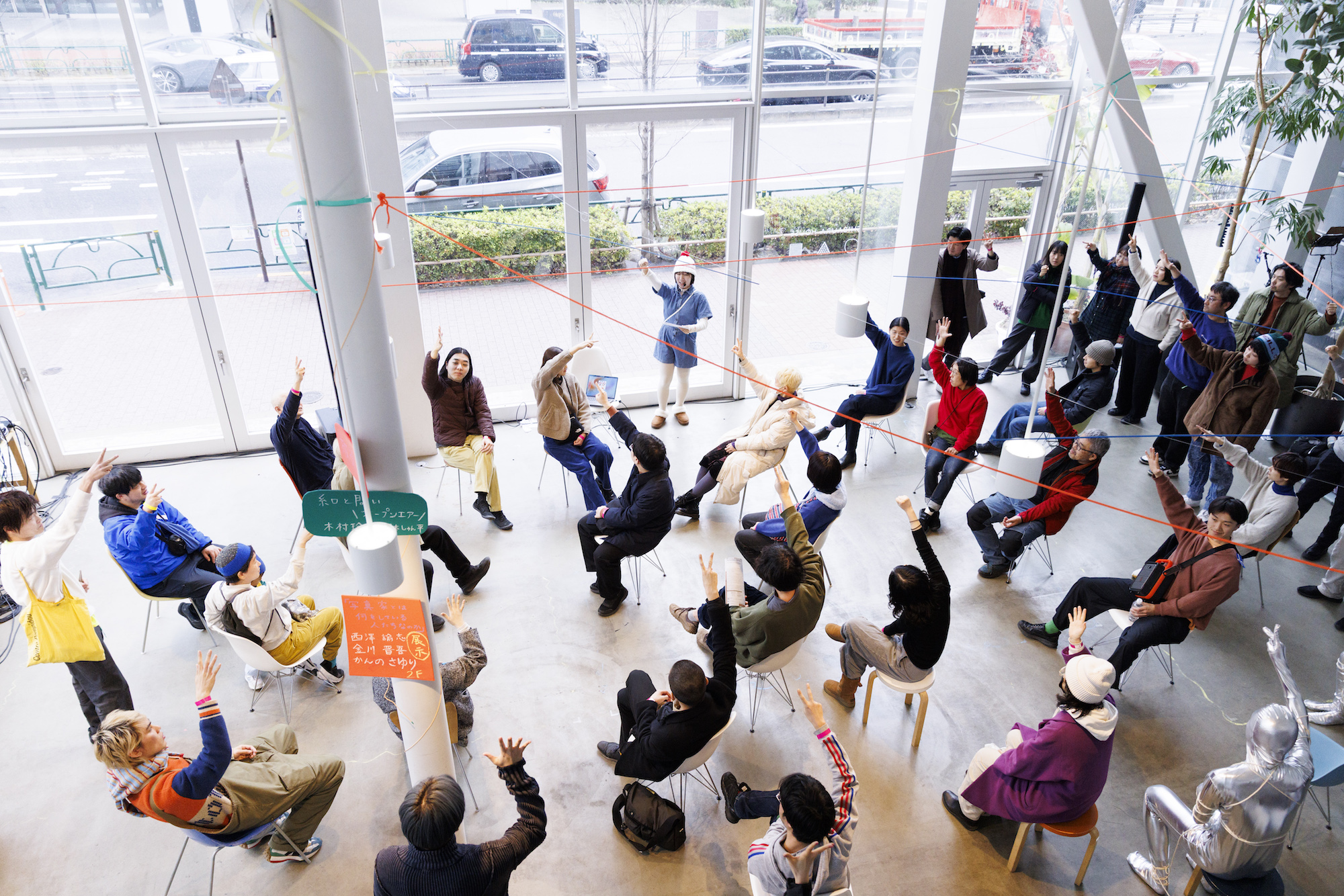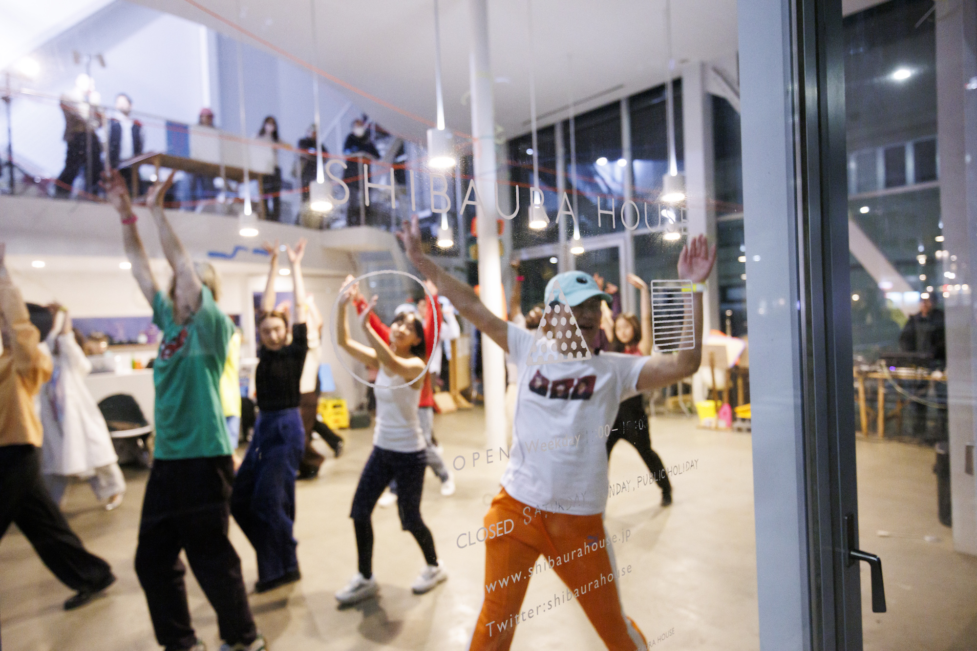 3区画をそれぞれぼーっと眺めてみる。室内は暖かいものの、寒さで体はこわばっていて、手のかじかみも残っている。まだこの場をどう楽しめば良いか、コツが掴めていない。さてどうしようかな、2階から順に回ってみようかな、そう考えながら座っていると、上から賑やかな一団が降りて来た。肩にラジカセのような曲を流す機械とマイクを持って、自由な動きをしている。どうやら上の階でワークショップ発表の企画をしているらしい。プログラムに目を落とす。Aokid・青柳潤ほか「シームレスに展開するショックノー!(職能)——ライブを生きる身体となんか応援する感じ」。どういうことだろう?と思っていると、マイクを1階の各区画の人々に向け始めた。なるほど、ワークショップを紹介してくれるらしい。