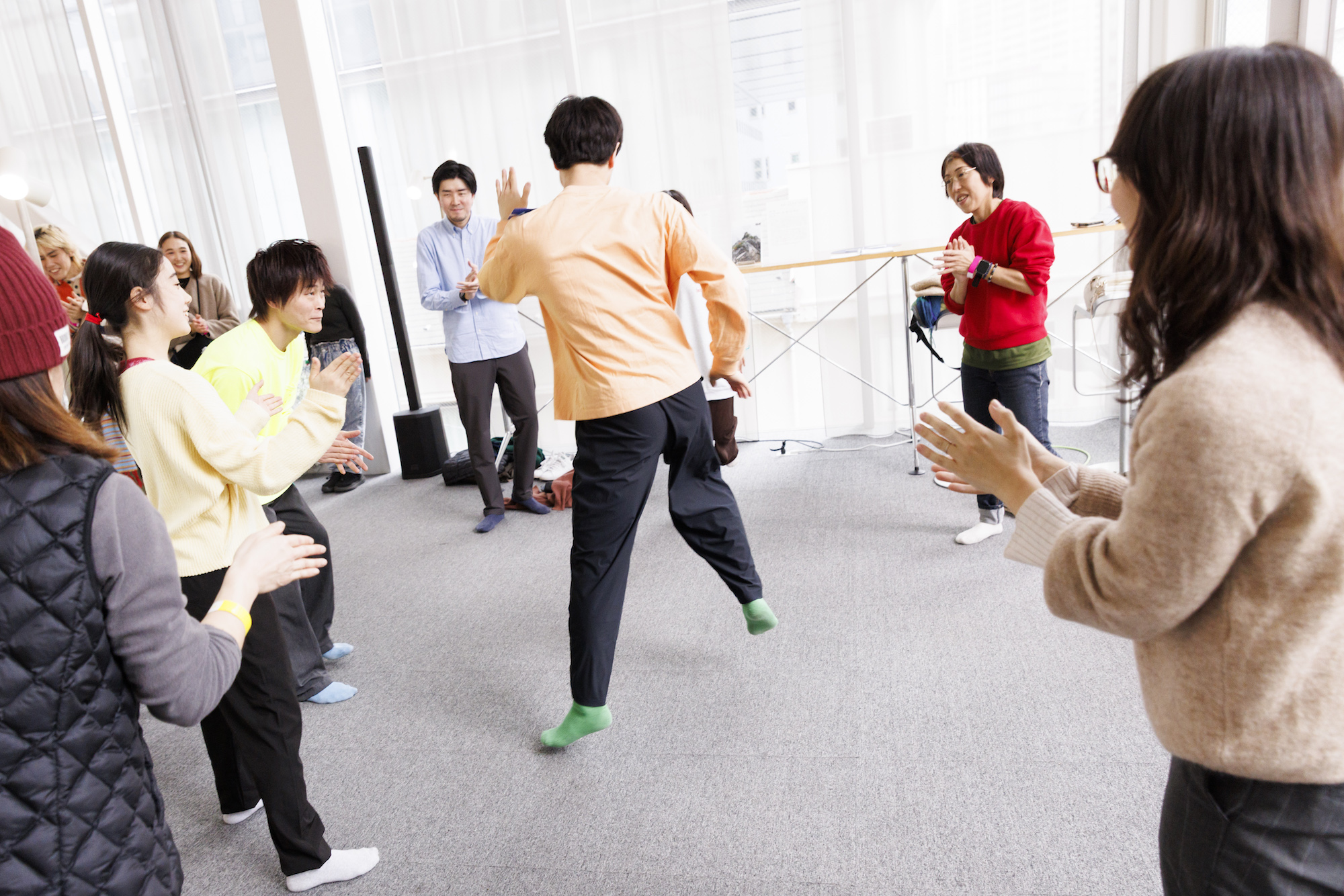 最初は簡単にいろんな部位を動かしていく。肩、腕、足、膝、身体の重心を上にしたり下にしたりと、普段運動していない私でもついていけそうな、ラジオ体操くらいなものかなと思っていた。が、どんどんと動きが増えてハードになっていく。リズムが自然と生まれ、各々の動きが好きなように混じっていく。しゃがんだりジャンプしたり、体操からやがて踊りへ。この体操、長い!半端な覚悟で挑んだため、とても長く感じる。足はもつれ、集中力が持たない。身体のコミュニケーションに慣れていなくて、場に対する動きの適切さが分からない!でも楽しくてずっと笑ってしまう。いや、適切さとかはないのか?身体を動かすままに動かすのって、案外経験がいるぞ?身体表現の引き出しに乏しいな、私って……と、脳みそがフル回転していく。