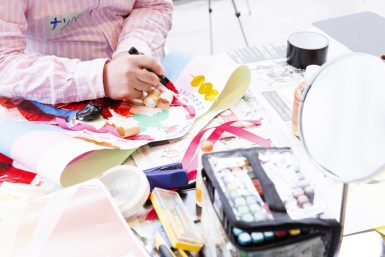 必死でチャンピオンベルトを制作している途中、A区画の武本さんのワークショップ参加者の方が、画用紙を広げている机の下に潜り込んで来た。不思議と違和感も怖さもなく、溶け込んでいる。この状況に突っ込みを入れたくなるような気持ちにもならなくて、もくもくとベルトを作り続ける。