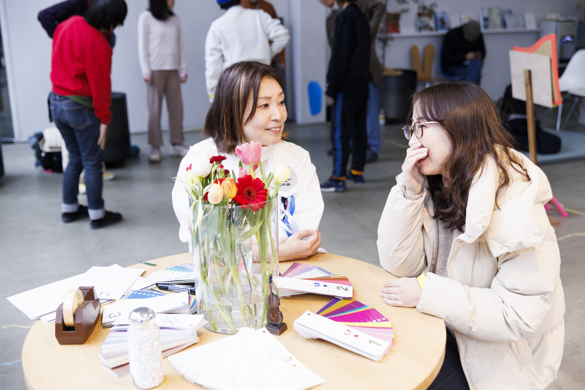 カウンター席から見て左側ではMaria de los Angeles Pais「つぎはぎの場所(today, I’m my home)」が始まっている。区画の中に紐を貼り、その紐に木製のピンチが挟まれていく。すでに一室の部屋のように空間が作られてきていた。真ん中ではazroom遠藤朝恵「色・存在の証明」。世界観デザイナーの遠藤さんと一対一でいくつかの質疑を交えながら話すと、自分のイメージの色を選んでくれるようだ。右側では福留麻里「私的で公共空間的な振付」。副題が「小さな動きからつくるミニ盆踊り」ということで、ワークショップに集まった人々と車座になって話し合っている。