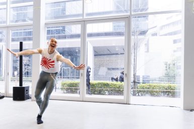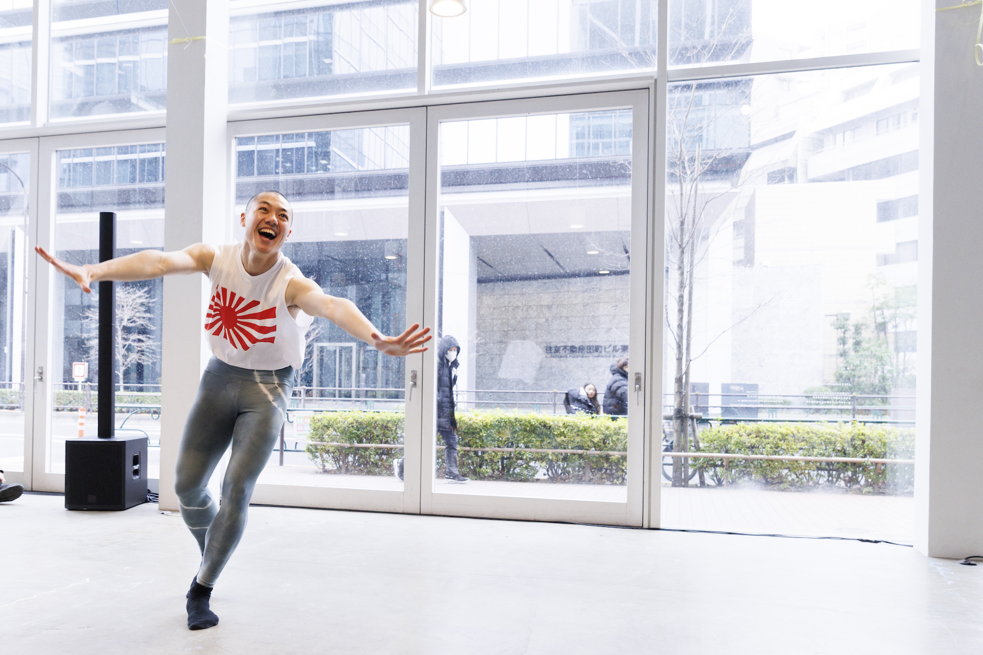 青飯の後味もあるうちに、山﨑広太「みんなでJomba」が始まった。Jombaってなんだろう?検索してもいまいち分からず、プログラムの説明を読むと「Zumba」というワードも出てくる。あらためてZumbaで検索すると、ラテン系の音楽を中心とした、コロンビア生まれのダンスフィットネスプログラム、らしい。エアロビの講師のような恰好をした山﨑さんが登場し、説明もそこそこに振付をし始めている。最初は奥のガラス窓を左手に、空間を横切るように振りをつけて歩いていく。まるでランウェイのように2列になって、山﨑さんの指示とお手本のもと、大きく足を広げて歩いてみたり、踊りながら歩いてみたりする。山﨑さんから「ボンジョビみたいな感じで!」「矢沢永吉みたいな感じで!」という指示が来るが、ボンジョビってどんな感じだっけ、矢沢永吉ってあまり知らなくて……とペアになった人としゃべりながらとりあえず動いて歩いてみる。