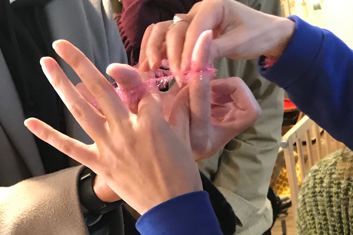 先ほど述べたように、木村は芝の家の人々にこう尋ねた。「モノやこと 建物や風景 身体も いつかなくなってしまうから、ダンスタイムカプセルで残したい記憶などはありますか?」。これを私は死神の宣告のように受け取った。頭では理解し、また特にこの五輪開催決定以来の15年、足や目、皮膚感覚で疑う余地もなく知っていた、故郷港区の喪失を、こんなにもあっさりと突きつけられ、しかも芝の家の人々は特にそれに対して拒否反応を示すことなく回答している。おそらく、同じ港区に住む私にとって、この質問と回答がこの地で成立するのを受け入れるためには、SF映画の連想を経由しないでは措かれなかったのだ。この私の極個人的な連想は、しかしながら、あながち無理筋のものではなかったらしい。というのも、そのあやとりの教本にこう記されていたからだ——「あやとりは宇宙である。」この一言は少なくとも私にとって、《ダンスタイムカプセル》の謎を解き明かしてくれるような衝撃を持っていた。しかし木村は別に、あやとりを入り口として、その日の観客全員を宇宙旅行のイメージへ誘導したかったわけではないだろう。[*2]私がそれを宇宙旅行だと感じたのは、耳栓とあやとりという小道具によるところが大きい。観客ひとりひとりが耳栓をして互いの音を聞きづらくなることで、各人が互いを遠く感じる。さらに、あやとりによって、孤独な人々は指先の動きに意識を向ける。そのとき両手のあいだでは「橋」や「東京タワー」を作るという、実寸よりもはるかに大きな事業を遂行しているのだ。耳栓とあやとりによって体感の縮尺を変化させることに成功し、それによって芝の家の空間の「狭さ」を感じさせずに、むしろ「宇宙大」にまで拡大させたのである。
